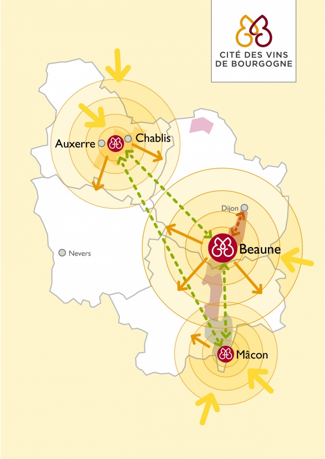 La Cité des vins et des Climats de Bourgogne est un projet en réseau, composée de trois équipements culturels, trois portes d’entrée, à Beaune, Chablis et Mâcon. Chacun de ces trois pôles valorisera les vins de toute la Bourgogne.